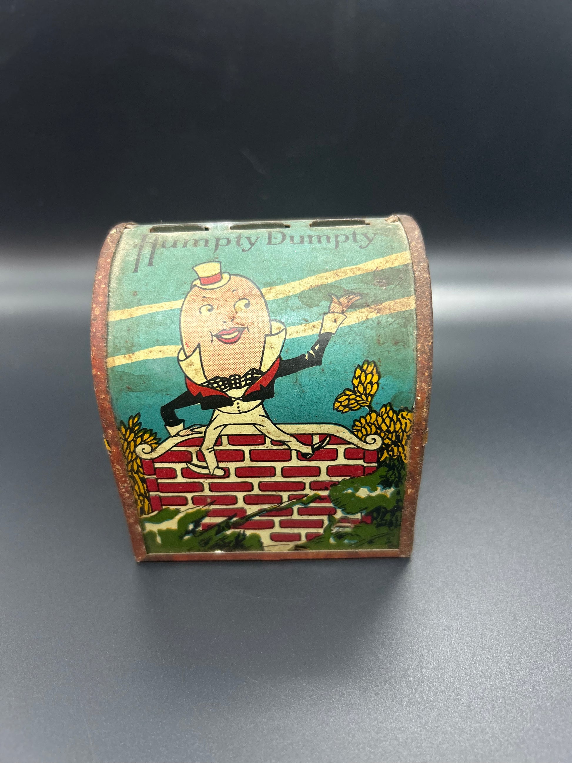 Vintage tin toy in working condition. This is a little folks cash register featuring nursery rhyme Humpty Dumpty. Cash register is in fair condition with some rust on the exterior.